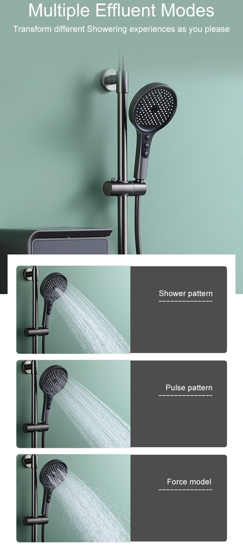 Type:Hot and Cold Mixer(Intelligent digital display) Main Body Material:PPA+Tempered Glass Top spray material: ABS Handheld material: ABS Valve Core: Ceramic Water Outlet Nozzle Material: Plastic |