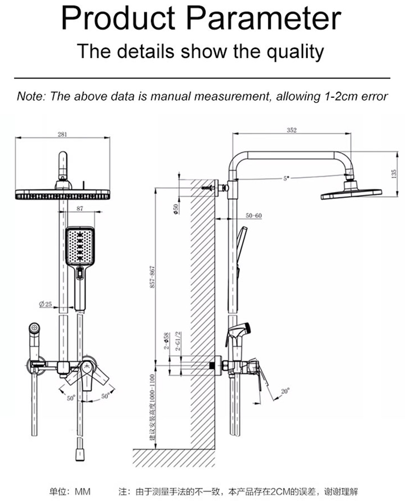 The wall-mounted Shower System represents a harmonious blend of form and function, offering a stylish and practical solution for modern bathrooms. Its sleek black finish, combined with its space-saving design and customizable features, make it a popular choice among homeowners seeking to upgrade their bathroom experience.